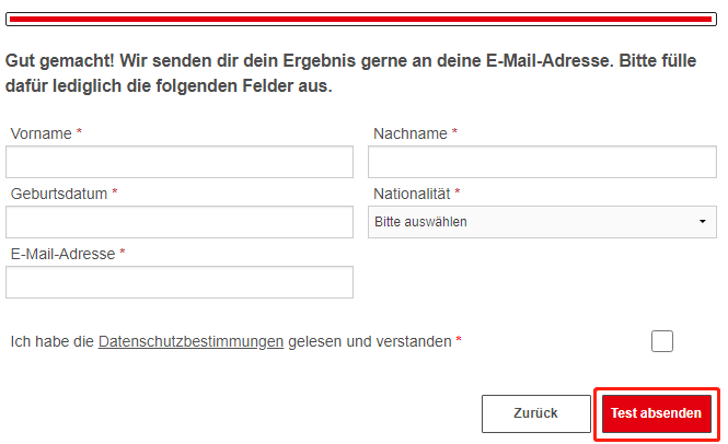 3、所有题目答完之后,填写个人信息及邮箱,点击网页右下角“Absenden”,测试结果将发送至所填写的邮箱。