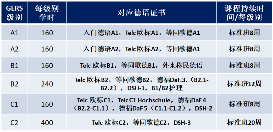 海德堡富优学院德语教学参照欧洲语言公共参考标准GER欧洲语言公共参考标准(Gemeinsamer Europäischer Referenzrahmen für Sprachen),简称欧标(德语简称GER,是被国际认可的描述语言能力和水平的标准,由欧洲委员会(Europarat)制定。GER专门为欧洲语种设计,可以被用来描述德语、英语、法语、西班牙语、捷克语、意大利语等超过40种语言的水平,使学习者的语言学习和语言能力变得透明和具有可比较性。因此,它为欧洲语言工作的课程指南、教科书和资格证书提供了基础。