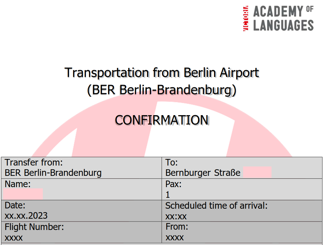取完行李以后,前往指定地点与接机人汇合,一般情况下接机人在机场出口等你,会手举写有你的名字或 VICTORIA | Academy of Languages字样的标牌。到达学员无需出示任何证件,告知接机人自己的名字即可。接机人员说德语和英语,不用担心。接下来,接机人员会带你到上车的地点,然后将你送到宿舍。