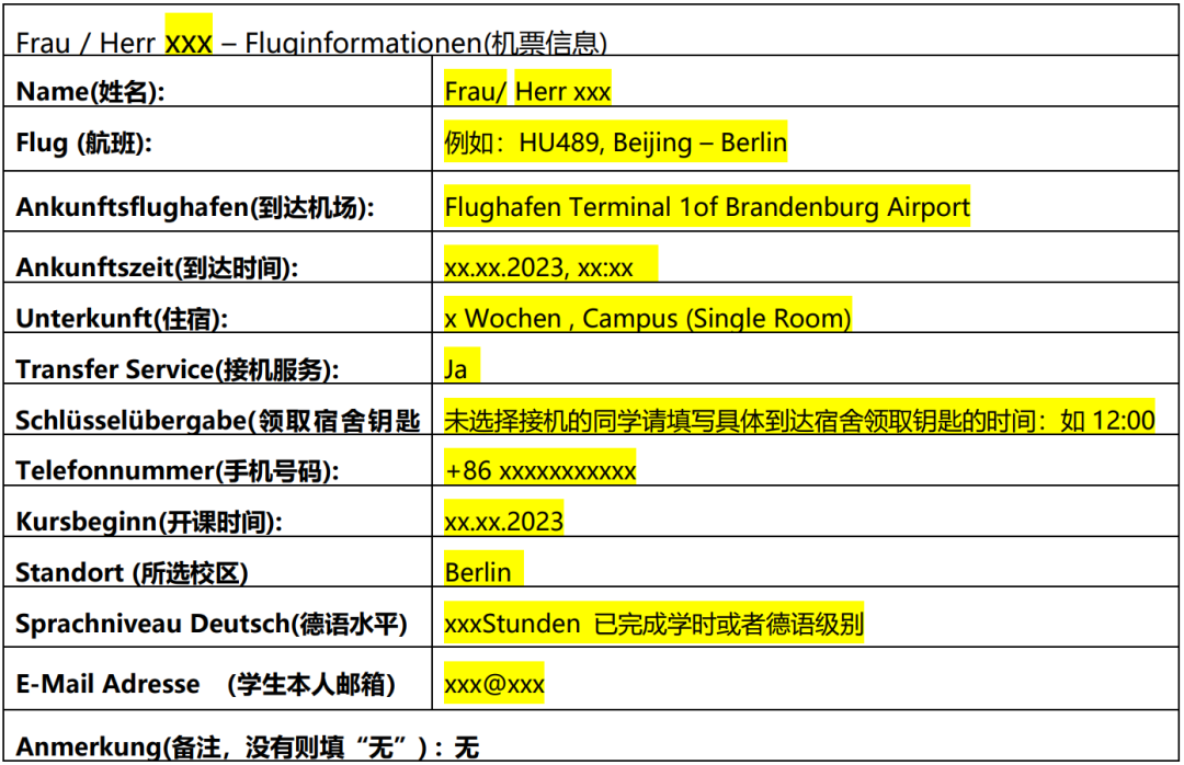 预定好机票后,找到代表处曾给你发的邮件,找到 “下签后订票须知”,将机票信息按照要求填写好,并在赴德前一周周三之前发送填写完整的《机票和到达信息表》发给中国代表处的邮箱fuuoffice@163.com,在收到你发来的航班信息后的1到2个工作日,也就是周五前会给你发送详细的接机信息到邮箱里。